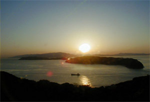 加太は、和歌山県の西端に位置し、瀬戸内海国立公園の東の玄関口にあります。休暇村のある、紀淡海峡を望む、小高い山の山頂からの眺望は、眼下に加太の瀬戸を見わたせ、遠望すれば内海に浮かぶ島々の配置の妙は、一幅の絵のようであります。特に、目の前に浮かぶ友ヶ島を背景に沈む夕日の美しさは圧巻。海を金色に染める光景は、まさに絶景です。
